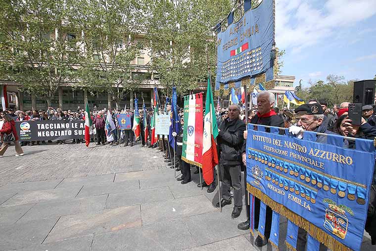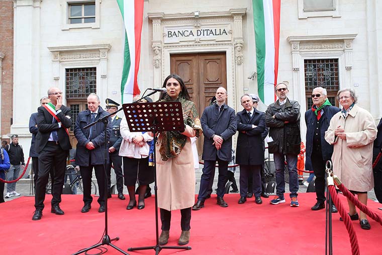 Dopo la messa in suffragio e memoria dei Caduti presieduta nella basilica della Ghiara dall’arcivescovo Giacomo Morandi, il corteo lungo la Via Emilia e da deposizione di Corone ai monumenti alla Resistenza e ai Caduti di tutte le guerre, le celebrazioni del 25 Aprile-Festa della Liberazione a Reggio Emilia sono proseguite con gli interventi del sindaco Luca Vecchi, di Giuseppe Pagani presidente Associazione nazionale Partigiani cattolici (Anpc) a nome delle Associazioni partigiane e della scrittrice e attivista di origini iraniane Pegah Moshir Pour in piazza Martiri del 7 Luglio.