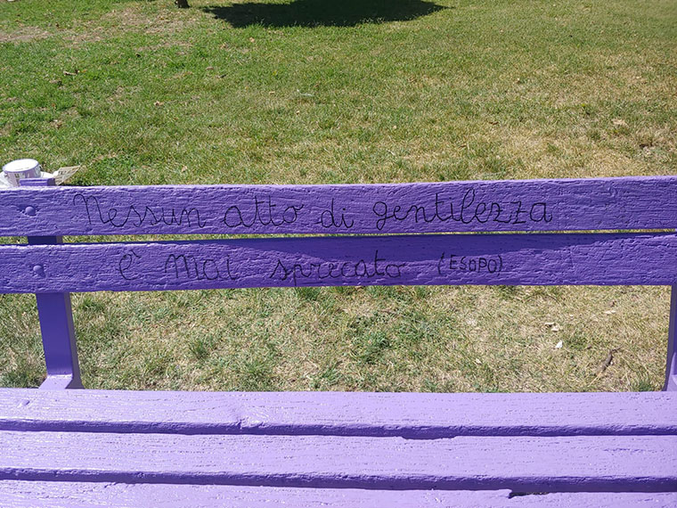 La prima panchina viola, realizzata al Parco del Liofante, riporta la frase di Esopo “Nessun atto di gentilezza è mai sprecato”. La panchina è uno spazio che, comunemente, richiama momenti di incontro ricreativi, di sport, di relax e socializzazione. Il viola è un colore che nasce dall’unione del blu (profondità) e del rosso (concretezza) che identificano la gentilezza.