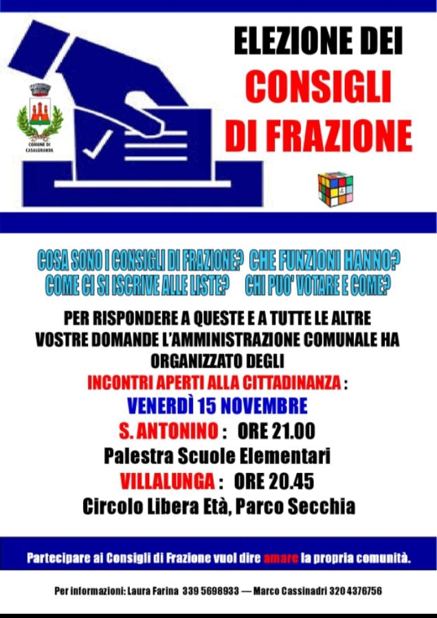 Il Comune di Casalgrande presenta ai suoi cittadini i “Consigli di Frazione” attraverso una serie di incontri che si terranno a Salvaterra, Villalunga, Sant’Antonino, Veggia e Casalgrande nelle giornate del 12 e 15 novembre.